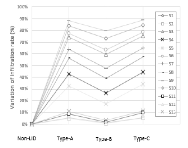 - Rapid changes in rainfall patterns due to climate change are intensifying urban water cycle challenges, especially during extreme storm events. In response, the application of Low Impact Development (LID) techniques has been increasingly promoted. This study evaluates the hydrological effectiveness of permeable pavement, a representative LID strategy. Laboratory experiments were conducted to assess its structural performance under different clogging conditions. These results were incorporated into a SWMM-LID model to simulate water cycle improvements across various watershed scales. Simulations analyzed changes in total evapotranspiration (TE), total infiltration (TI), total surface runoff (TR), and peak runoff. The results showed that hydrological effects varied depending on pavement type, coverage, and watershed characteristics. TE increased by over 70%, TI by over 79%, and TR decreased by more than 5%, confirming the effectiveness of permeable pavement. However, peak runoff showed no significant change, likely due to the flat terrain and characteristics of long-term rainfall patterns in the study areas. Interestingly, in some watersheds with naturally high infiltration capacity, a reduction in infiltration was observed, highlighting that hydrological outcomes can differ depending on land use, soil permeability, and spatial distribution of LID facilities. These findings suggest that LID strategies should be applied selectively based on watershed characteristics. Future studies should incorporate GIS-based spatial analysis, long-term performance evaluation, and institutional improvements for effective maintenance and debris management.