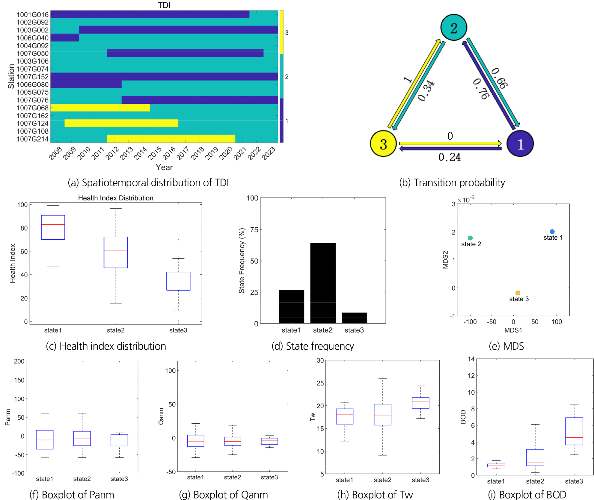 - This study utilizes the Trophic Diatom Index (TDI), Benthic Macroinvertebrate Index (BMI), and Fish Assessment Index (FAI) to evaluate the aquatic ecosystem health (AEH) of the Namhan River basin. By applying the Hidden Semi Markov Model (HSMM), the study aims to analyze the transition probabilities and complex patterns of AEH, thus providing critical insights into the dynamic changes and underlying causes within the ecosystem. The study particularly emphasizes the impact of water quality and hydrological variability on ecosystem management and conservation strategies. The TDI analysis indicates that State 1(Good) presents the highest water quality, suggesting potential habitats for diverse biota, while State 3(Poor) shows low TDI values, reflecting high nutrient levels and water quality issues that negatively impact the ecosystem. State 2(Moderate) represents an intermediate level between these extremes, with water quality and hydrological variability playing crucial roles in state transitions. The BMI analysis reveals that State 2(Good) exhibits excellent AEH, with high diversity and abundance of benthic macroinvertebrates. In contrast, State 1(Moderate) shows a relatively stable yet stressed ecosystem, and State 3(Poor) is characterized by significantly deteriorated AEH. FAI results show that State 2(Good) has a robust fish population and good water quality, indicating high ecological health. Decreases in FAI values in States 1(Moderate) and 3(Poor) suggest varying levels of stress, with temperature and BOD increases identified as major driving factors. This study highlights the need for a comprehensive approach to assessing and managing the ecological health of the Namhan River basin, incorporating various ecological indicators and hydrological variability. Understanding the characteristics of each state and developing management strategies based on these insights are essential for sustainable AEH management. Developing and implementing strategies to maintain and promote each state will play a crucial role in ensuring the sustainability of the river basin’s ecological health.