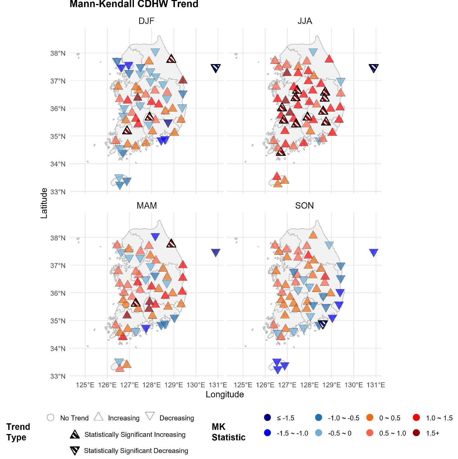 - Compound drought-heatwave (CDHW) events, in which extreme heat and drought coincide, are occurring with increasing frequency and intensity in single events with climate change. These compound disasters lead to more complex and intensified socio-ecological risks compared to single hazards, making it crucial to understand their occurrence characteristics from various perspective of view. This study analyzed the spatio-temporal characteristics of seasonal long-term change patterns of CDHWs across the Korean Peninsula. The analysis revealed a significant long-term increasing trend of CDHWs across the Korean Peninsula, with a particularly pronounced increase in summer occurrences. Regionally, CDHW occurrences were prominent in inland central regions, basin areas including Gyeongsang Province (e.g., Daegu), and the Gangwon region. These areas also exhibited clear increasing trends of CDHW in spring and winter. This study quantitatively presents the seasonal and regional spatiotemporal characteristics and long-term trends of CDHWs, thereby contributing to understanding the increasing tendency of compound drought-heatwave disasters due to climate change and enhancing the nation's capacity to respond to future extreme climate events.