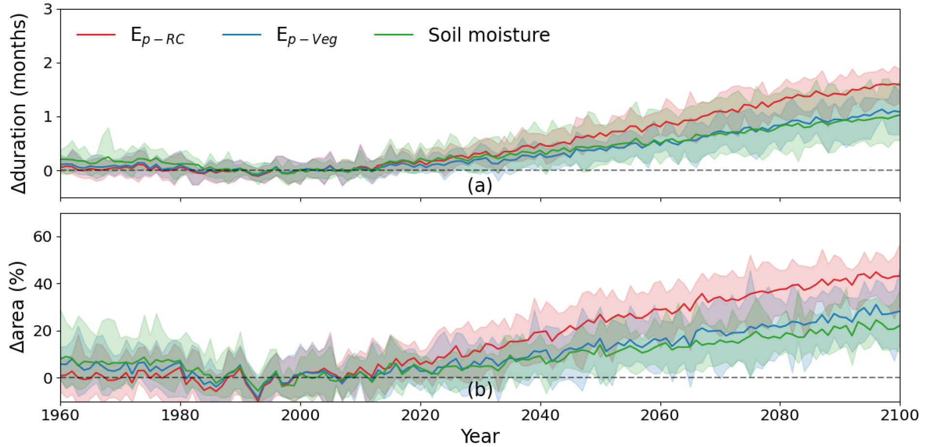 - Climate change is increasing atmospheric evaporative demand (Ep), a key driver of future drought. However, conventional Ep estimation methods neglect the physiological responses of vegetation to rising atmospheric carbon dioxide concentration and vapor pressure deficit. To assess this impact, we projected future agricultural drought risk by applying two Ep models to outputs from 10 Coupled Model Intercomparison Project Phase 6 Earth System Models: a conventional formula (Ep-RC) and a two-source model (Ep-Veg) that dynamically considers changes in surface and aerodynamic resistances. We then used these Ep estimates to drive a precipitation-based (Standardized Precipitation-Evapotranspiration Index, SPEI) and an evaporation-based (Evaporative Stress Index, ESI) drought index. The resulting projections of drought duration and area through 2100 under different Shared Socioeconomic Pathways were compared against a benchmark soil moisture-based index (SSI). Our results show that Ep-RC consistently overestimates future drought severity and area compared to Ep-Veg. The projections using Ep-Veg were more consistent with the SSI benchmark, confirming that accounting for the water-saving effects of vegetation provides a more realistic risk assessment. However, a significant and growing discrepancy between the ESI and SSI projections remains, even when using the refined Ep-Veg model. This suggests that while modeling vegetation physiology is crucial, inherent structural limitations within the Ep framework, driven by land-atmosphere interactions, are also major uncertainty sources in future drought assessments.