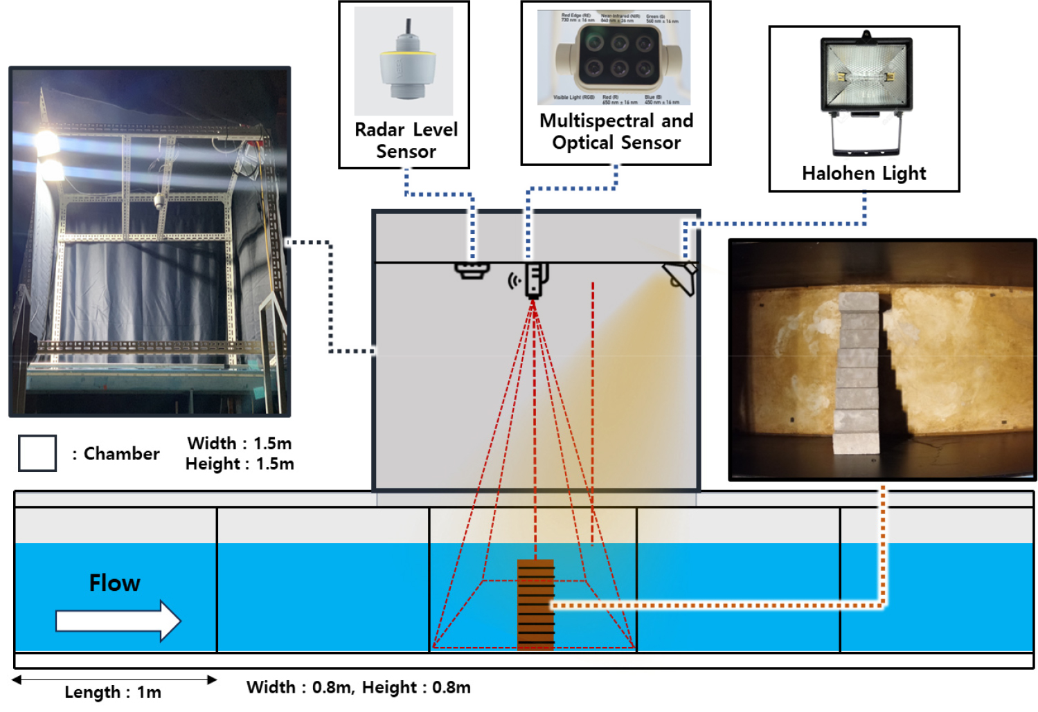- This study examined the variability of spectral data according to sediment material for water depth monitoring in sewer and stormwater pipes. While spectral data-based depth monitoring has been consistently researched for many years, studies targeting enclosed environments such as sewers and stormwater pipes without a specific light source remain limited. During rainfall, various foreign substances present on road surfaces flow into sewers and stormwater pipes, leading to the formation of sediment deposits within the pipelines. The particle size of sediments influences reflectance intensity, with the visible, blue, and green wavelength bands responding sensitively to changes in particle size. Therefore, this study conducted indoor experiments to investigate the variability of spectral data according to actual sediment material entering sewers and stormwater pipes, aiming to achieve accurate depth monitoring. A halogen light source was used with an illuminance of 720 lx, and experiments were conducted under darkroom conditions with various particle sizes and sediment heights corresponding to different water depths. Spectral data were collected using a multispectral camera, and the collected multispectral images were processed using the Optimal Band Ratio Analysis (OBRA) method to estimate water depth. The results showed that the optimal band ratio and depth estimation accuracy varied depending on particle size. Furthermore, the optimal band ratio combination differed across sediment materials, indicating that a combination effective for one material may perform poorly for another. This study experimentally evaluated and analyzed these variations to improve the accuracy and applicability of sewer and stormwater pipe depth monitoring using spectral data, contributing to enhanced monitoring performance in such environments.