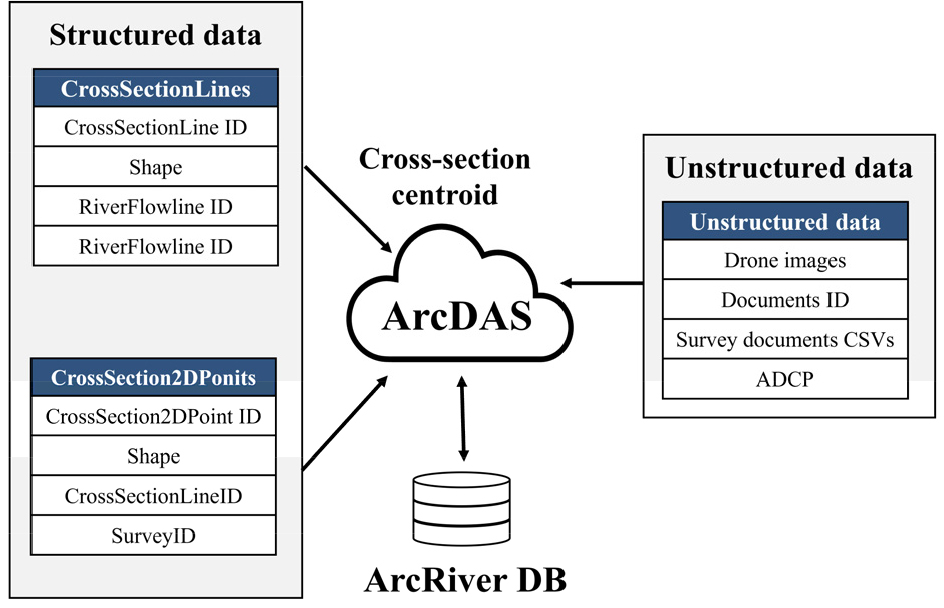 - Efficient management and analysis of river data are essential for flood prevention, river design, and water resource management, necessitating technological advancements to overcome the limitations of conventional data management systems. This study proposes an integrated river data management system utilizing the ArcDas platform and Web-GIS technology to systematically manage various structured and unstructured data sources, including river master plan data, CAD data, drone imagery, and sensor data. The proposed system was applied to two study areas, the Geum River-Miho Stream confluence and the Nakdong River-Nam River confluence, to verify its effectiveness. In particular, this study developed a data processing method to automatically extract cross-section data from CAD files of the river master plan and convert it into HEC-RAS input files (Geometry), significantly reducing data processing time compared to manual methods. The results indicate that the proposed system enhances data processing efficiency by automating CAD-to-HEC-RAS data conversion and integration, while also maximizing the usability of river environment analysis through real-time data visualization using Web-GIS. Furthermore, by transitioning from point-based data management to a continuous cross-section-based data management system, the study confirmed that data consistency and usability were significantly improved compared to conventional point-based management methods. This research presents a new paradigm for integrated river data management and analysis, addressing inefficiencies in Korea’s current river management system and strengthening data-driven decision-making support.