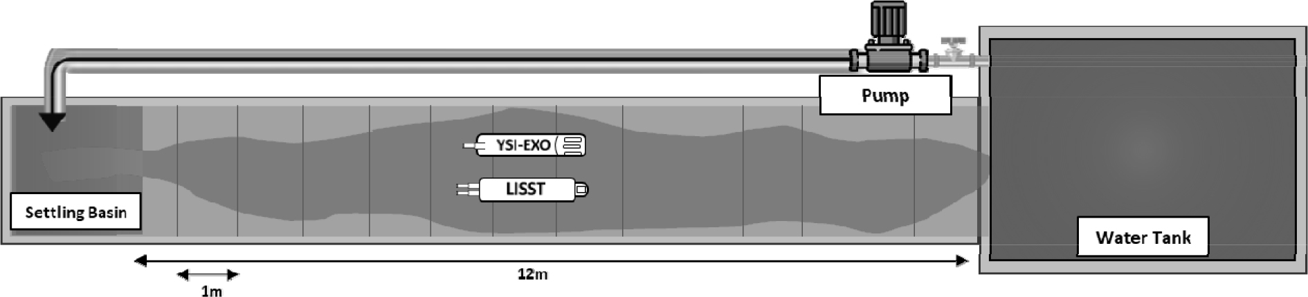 - Recent extreme rainfall and typhoon events driven by climate change have caused severe high-turbidity problems in reservoirs and rivers, posing significant challenges for water quality management. Conventional methods for measuring suspended sediment concentration (SSC) rely on manual sampling and laboratory analysis, which are time-consuming and unsuitable for real-time monitoring. Furthermore, the accuracy of turbidity–SSC relationships is often compromised by variations in particle size distribution, while high-turbidity conditions induce multiple scattering within the optical path, leading to overestimation of both concentration and particle size. To address these limitations, this study evaluated the applicability of the LISST-200X equipped with a Path Reduction Module (PRM) for SSC measurements under high-turbidity conditions. Experiments were conducted in an indoor recirculating flume using four particle-size fraction scenarios derived from sediment distributions observed in the upstream region of the Soyang River Basin. SSC was sequentially measured using both the standard LISST-200X and the PRM-mounted LISST-200X, while turbidity was simultaneously monitored with a YSI-EXO2 sensor. The acquired datasets were stratified by particle-size fraction, and variability was reduced by applying temporal averaging and a median filter technique. The results showed that the measurement range expanded from approximately 250 FNU with the standard LISST-200X to 300 FNU with the PRM, confirming the feasibility of stable monitoring even under high-turbidity conditions. Incorporating particle-size stratification significantly improved the linearity of turbidity–SSC relationships, with the median filter effectively removing outliers and reducing variability. This study provides experimental evidence that the LISST-200X with PRM can serve as a practical tool for SSC monitoring in high-turbidity environments, while also demonstrating that integrating particle-size variability and correction techniques enhances the accuracy and reliability of turbidity-based SSC estimation models.