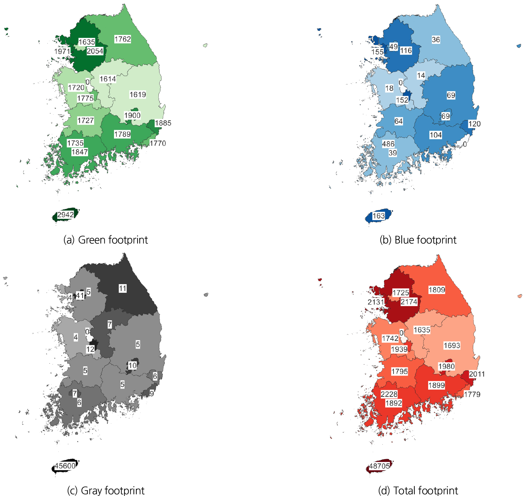 - Water, energy, and food are interconnected as key resources for human life and sustainable development. The water footprint methodology is gaining attention as a way to integrate consumption across resource sectors based on common standards and quantitatively analyze regional characteristics and interactions between sectors. This study characterized the water consumption of energy and food sectors across 17 Korean provinces by analyzing their water footprints. In the energy sector, considering energy source consumption, cooling methods, and regional water stress indices, Ulsan registered the highest water footprint (1,083.7 m3/ton), Chungnam (621.5 m3/ton) and Incheon (600.8 m3/ton) also ranked high largely reflecting their extensive power generation and industrial structure. On the other hand, solar and wind power were the lowest among all energy sources, confirming them as environmentally friendly sources with negligible water resource burdens. In the food sector, the water footprint was calculated by distinguishing green (rainwater), blue (irrigation), and gray (pollution dilution) water footprints, focusing on rice cultivation. The total national average water footprint was calculated to be 4,821 m3/ton. Excluding Jeju, the national average was approximately 1,900 m3/ton. For inland regions excluding Jeju, with green water dominating the composition (over 90%), blue water and gray water comprised only 3-5% and less than 1%, respectively. This pattern highlights the predominant reliance of the Korean food sector on rain-fed agriculture. This study effectively compared the relative scale and spatial distribution of water consumption across the energy and food sectors by quantifying their resource usage in a single unit (m3). The results can be used to establish integrated resource management strategies based on water-energy-food Nexus and to develop policies responding to climate change.