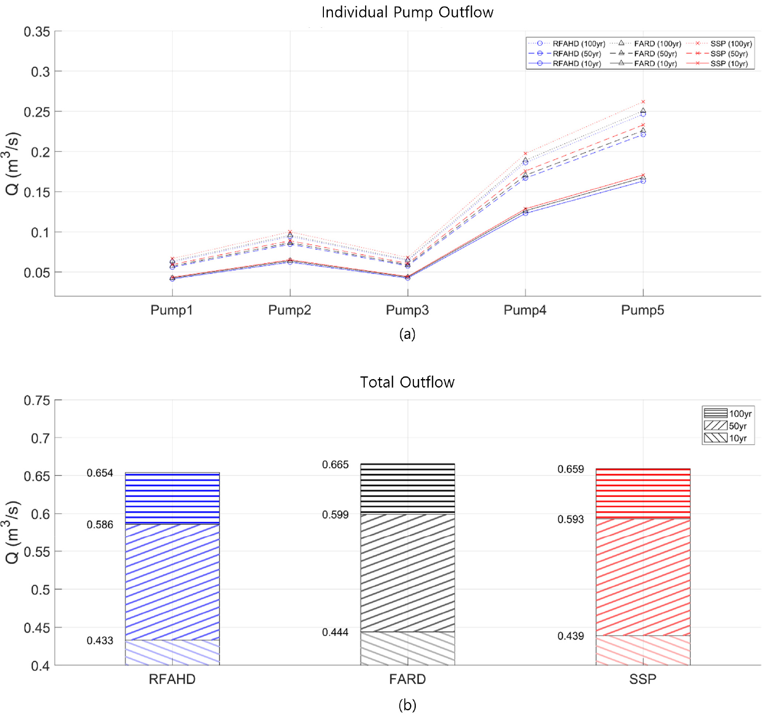 - Unanticipated natural disasters, especially flash floods, are rising under global climate change and intensify risks to hydraulic infrastructure. This study presents a comparative evaluation of two frequency analysis tools, RFAHD (Regional Frequency Analysis for Hydrological Data) and HEC SSP (U.S. Army Corps of Engineers Statistical Software Package), for design flood estimation. Continuous sub hourly rainfall records from 1961 to present at Busan observation station No 159 in Jung-gu, Busan, serve as input. RFAHD derives flood magnitudes by conducting annual maximum rainfall frequency analysis and coupling results with a rainfall runoff model, whereas HEC SSP applies Bulletin 17B and 17C statistical methods directly to flood data. By running both tools on identical datasets, we quantify differences arising from hydrologic model selection and statistical distribution assumptions, with special attention to intensity duration frequency curve extrapolation. Results highlight systematic biases in extreme‐event estimates and underscore each tool’s suitability. Our findings inform the choice of analysis software for robust hydraulic structure design under changing climate conditions.