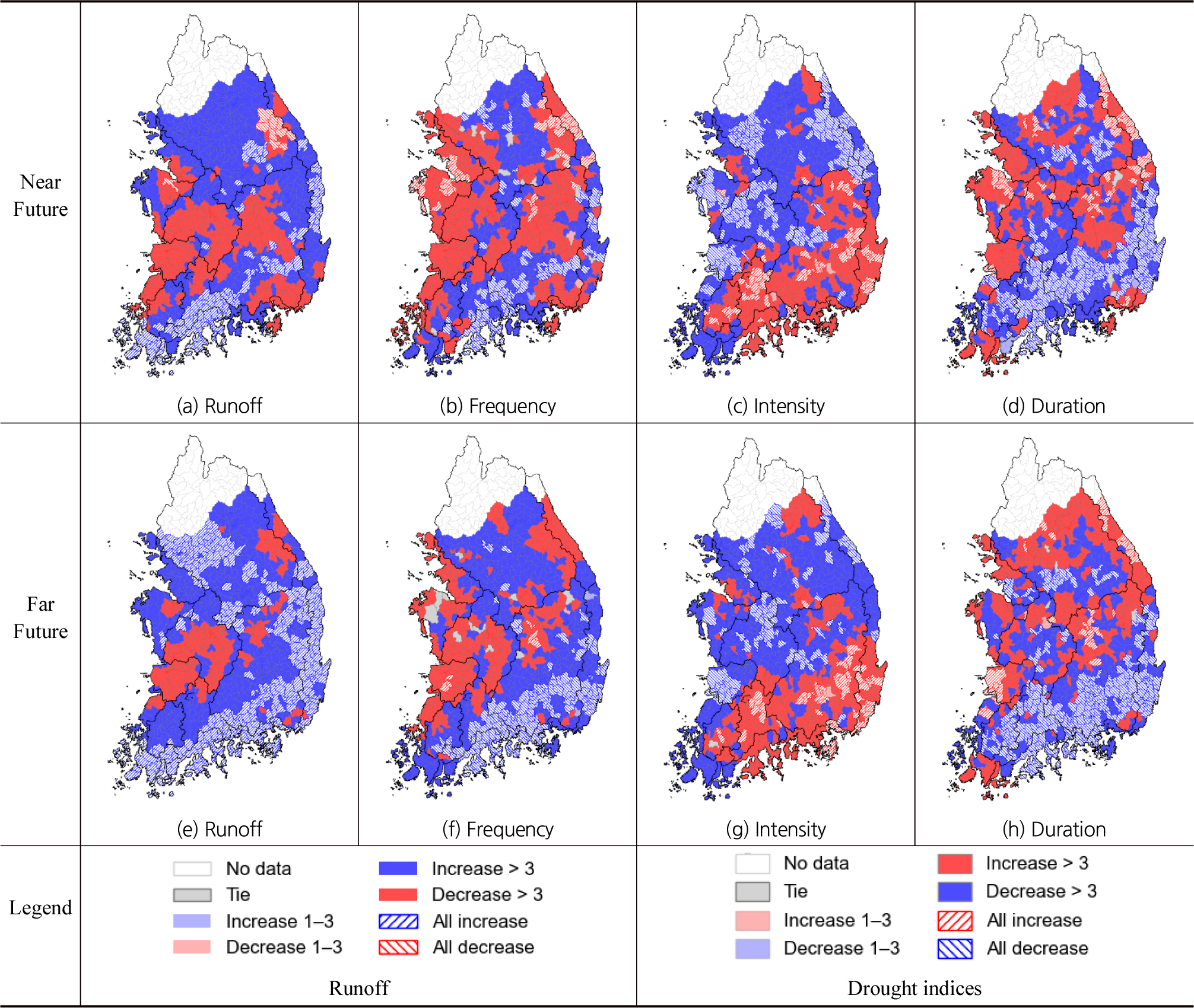 - This study aims to project future runoff and drought conditions in South Korea’s five major river basins under AR6-based climate change scenarios. By simultaneously analyzing changes in runoff and drought across all basins, this study overcomes the fragmentation of previous research caused by differences in study regions, time periods, and methodologies, and enables direct comparison of regional changes under consistent criteria and conditions. Out of 20 climate change scenarios provided by the Korea Meteorological Administration (KMA), seven were selected, and a hydrological model was applied to simulate runoff. Based on the projected runoff, the Standardized Runoff Index (SRI) was calculated to assess drought characteristics. For the reference period (1991-2020) and two future periods (2031-2060 and 2061-2090), changes in mean runoff, coefficient of variation (CV) of runoff, and drought frequency, intensity, and duration were evaluated. The results indicate that future runoff will increase in all basins except the Geum River Basin, suggesting a potential expansion of water resources, with the Seomjin River Basin showing the largest increase in the far future (+20.2% compared to the reference). Nationwide, the CV of runoff is projected to increase by approximately 15% in both future periods, implying a partial decline in hydrological stability, although the magnitude of change is relatively small. Drought frequency is projected to decrease in most basins; however, the Geum and Yeongsan River Basins are projected to experience significant increases (+70.8% and +20.7%, respectively) in the far future. Drought intensity is generally projected to worsen, except in the Seomjin River Basin (-3.3%). Drought duration is projected to decline in most basins, with the Geum River Basin being the only exception (+8.3%). Overall, the Geum River Basin is identified as the most vulnerable, with increases in drought frequency, intensity, and duration. In addition, this study compared the results with previous AR4- and AR5-based studies and recent regional studies conducted using AR6 scenarios to analyze the consistency and differences arising from scenario generations and spatial scales. The comparison shows that although some differences exist depending on the scenarios and study regions, an overall increasing trend in precipitation and runoff is consistent, while drought risks are projected to intensify in specific regions. These findings emphasize the necessity of regionally tailored approaches for climate change adaptation. By providing a quantitative assessment of hydrological and drought variability at both national and basin scales, this study offers critical baseline information for developing national climate change adaptation strategies and basin-specific water resource management plans.
