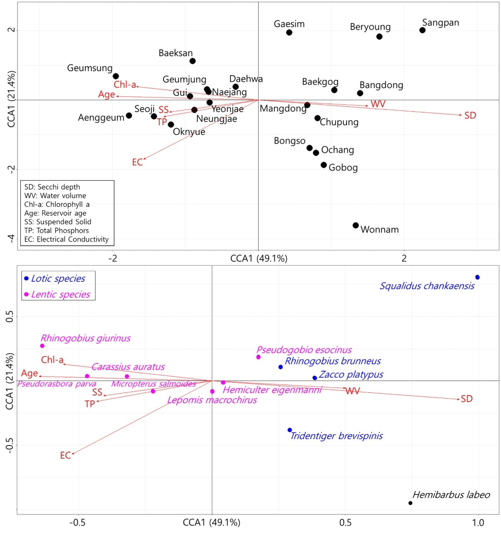 - This study analyzed the environmental factors affecting fish assemblages in 22 agricultural reservoirs of the Geum River watershed. The results indicated that water quality (including electrical conductivity, suspended solids, total phosphorus, chemical oxygen demand, total organic carbon, and chlorophyll-a) and reservoir age were the main factors influencing fish community structure, affecting species composition more than species diversity. As reservoir age increased, levels of electrical conductivity, suspended solids, total phosphorus and chlorophyll-a tended to increase, along with the proportion of lentic species. Rheophilic species, such as Zacco platypus and Rhinogobius brunneus, were mainly observed in younger reservoirs, whereas their importance decreased in older reservoir groups. These findings contribute to understanding the dynamics of fish communities and can serve as fundamental information for the ecological management and conservation planning of reservoirs.